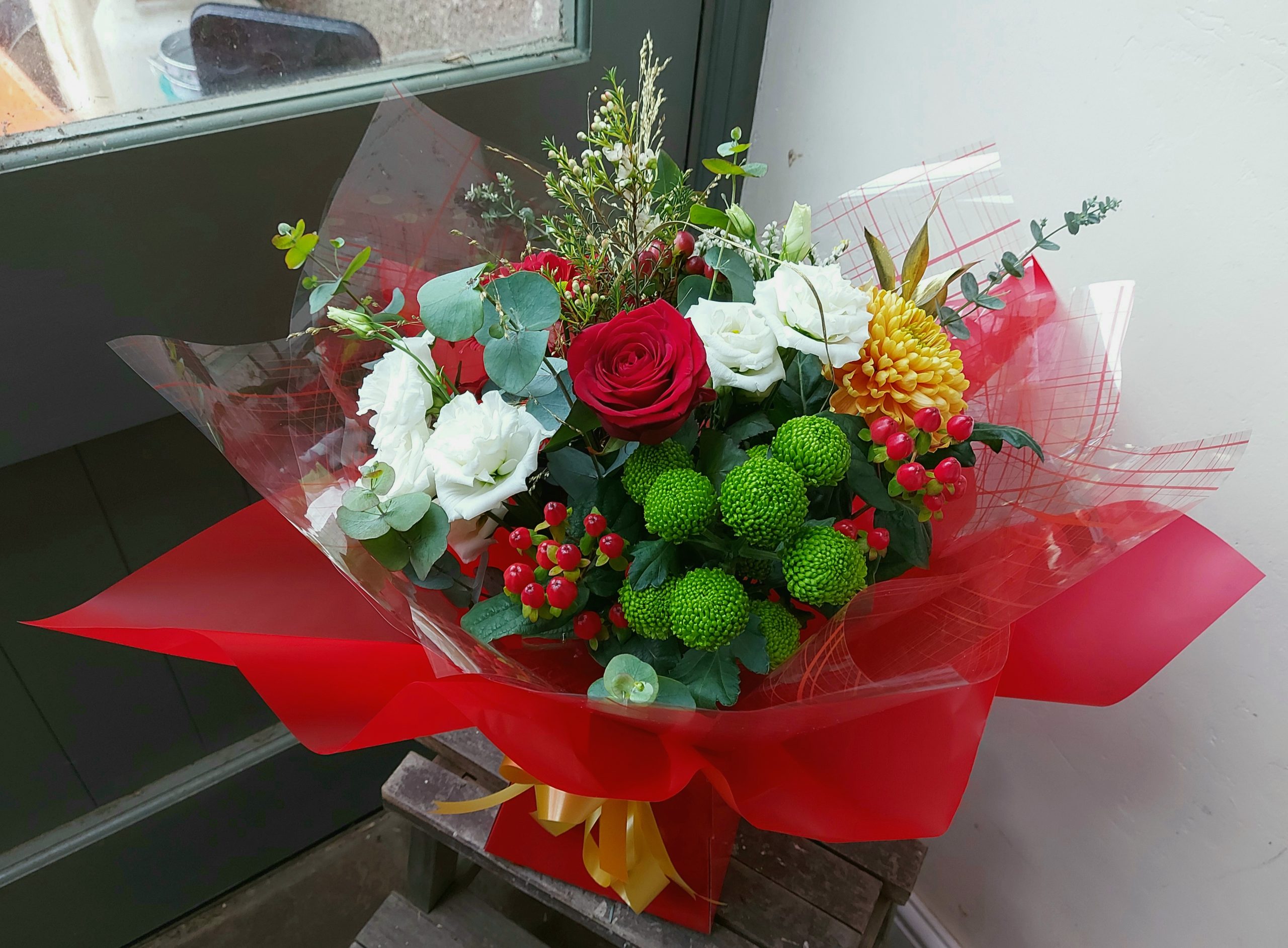 Both bouquet options will include a selection of flowers in Christmassy colours - reds, greens, golds and whites as well as sprigs of seasonal foliage and Christmas accessories.
