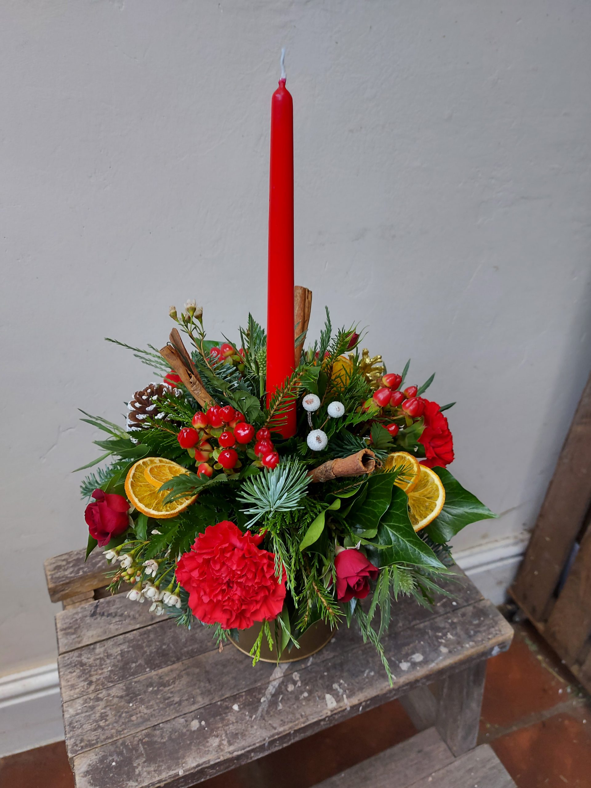 Christmas Candle Arrangements come in either a gold container or a basket and have a candle in the centre of the arrangement. The arrangement will include a mix of flowers and foliage as well as Christmas accessories. These arrangements start at £25.00.