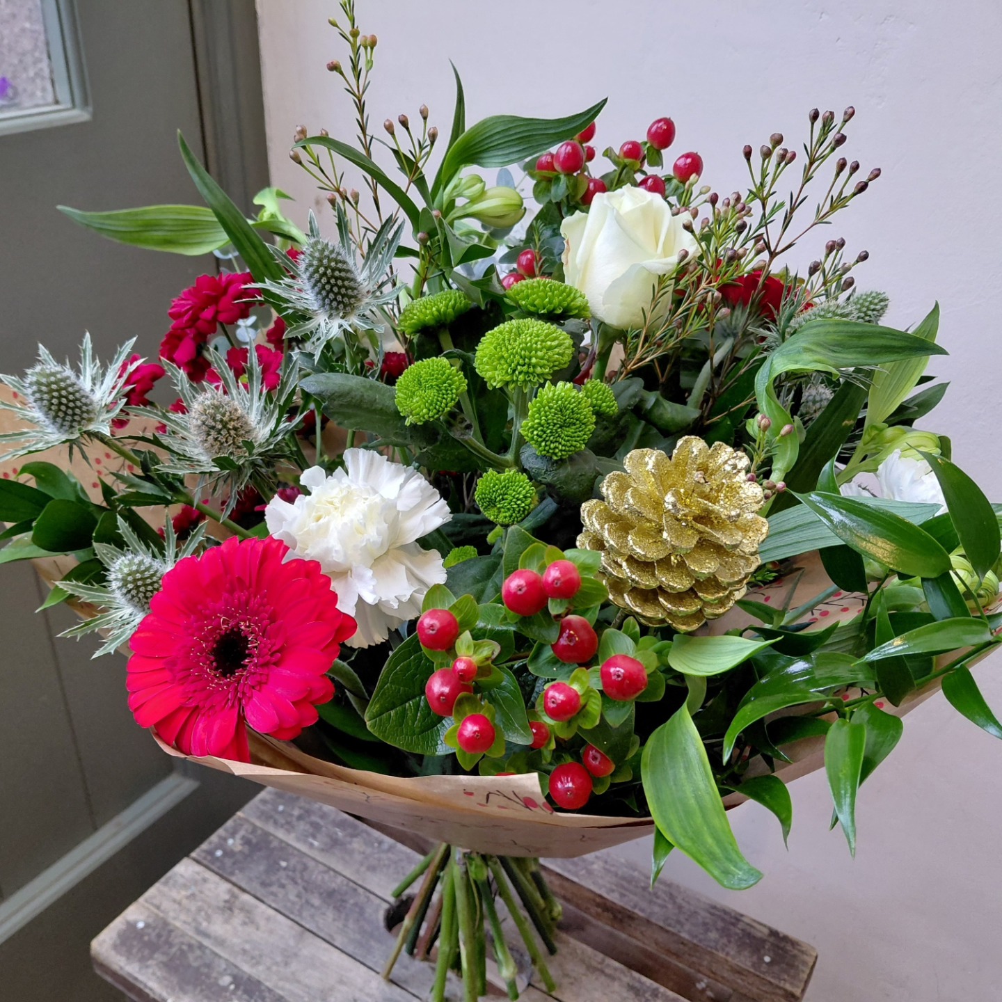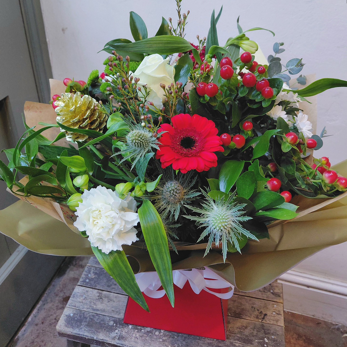 All bouquets & aqua packs will be made with a mix of flowers in festive colours, similar to the examples shown below. Bouquets will come wrapped in brown paper with a bow and aqua packs will come wrapped similarly to the picture below.