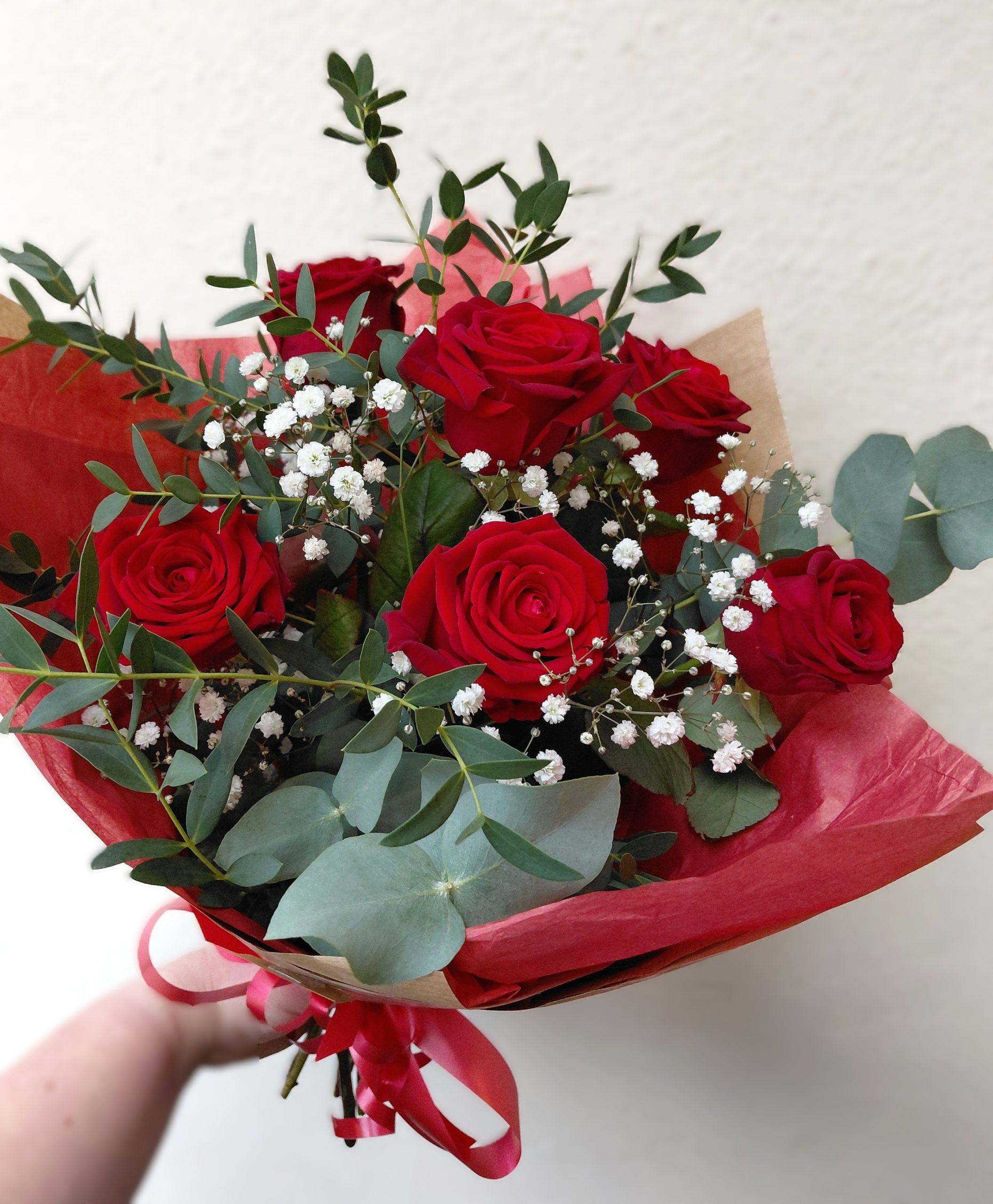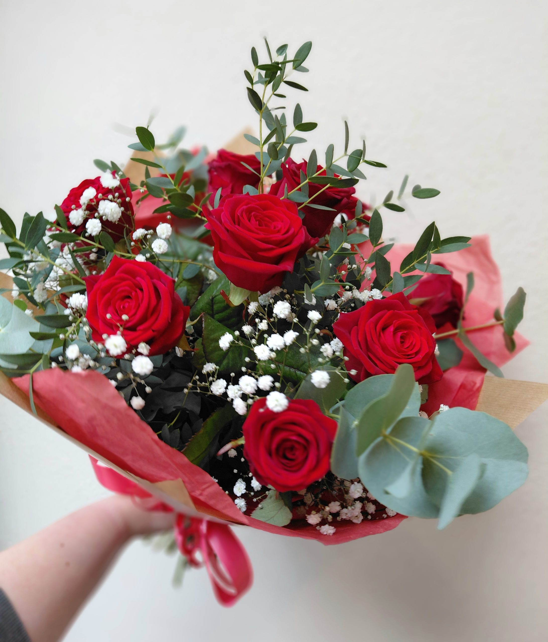 Red Rose bouquets will come with red Naomi Roses, white Gypsophila and a selection of greenery, similar to the photos below.