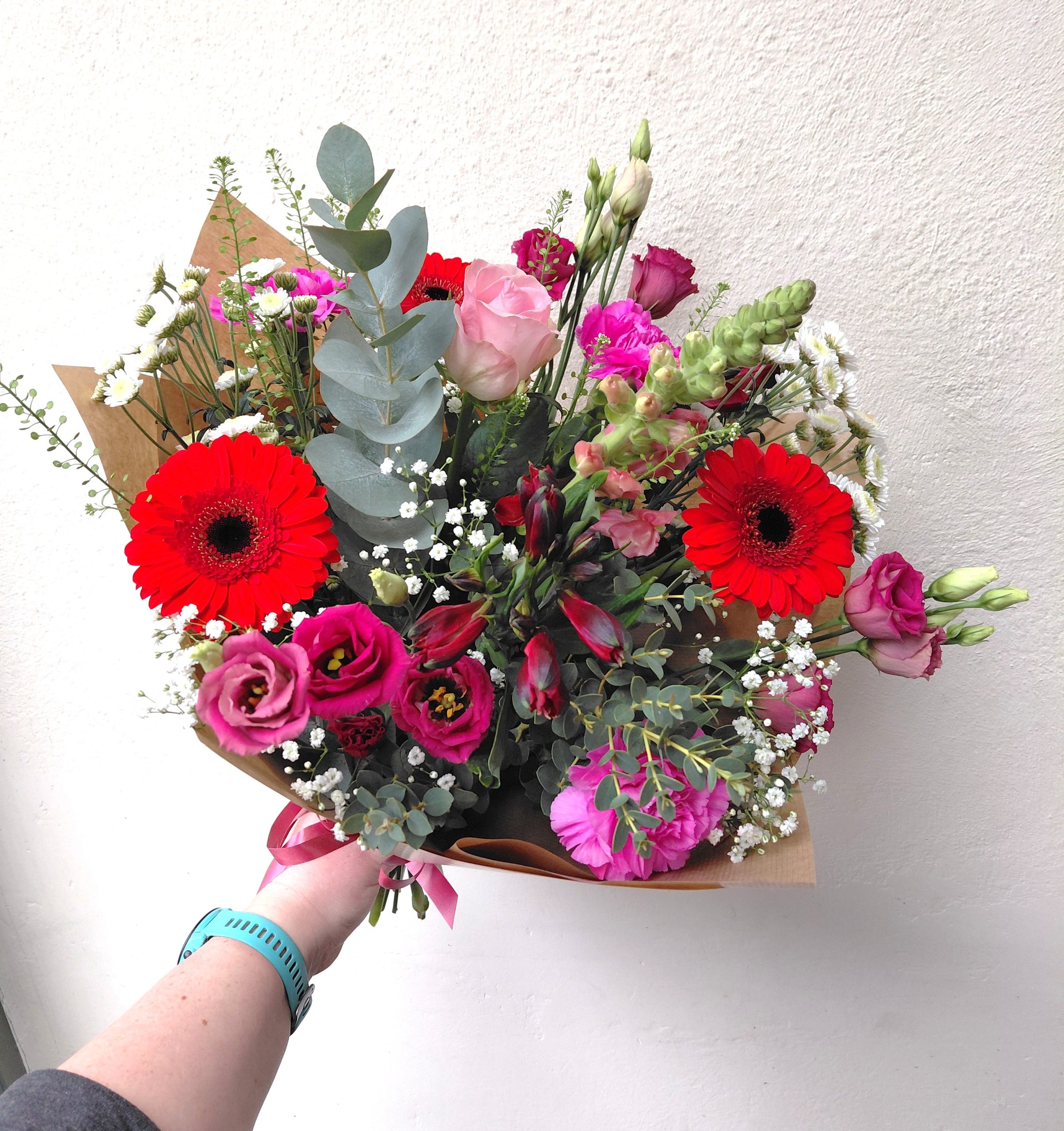 This bouquet will be made with a selection of pink, red and white flowers, including 1 pink Rose and foliage.